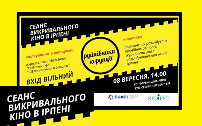 Громадська організація "Інститут розвитку регіональної преси" запрошує жителів Ірпеня 8 вересня поспілкуватися з журналістами провідних українських розслідувальних редакцій, викривачами з регіонів та під час кінопоказу. Усі присутні зможуть переглянути відео – журналістські розслідування щодо реалій в Ірпені, проведене командою...