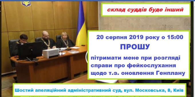 20 серпня о 15:00 у Києві в Шостому апеляційному адміністративному суді розпочнеться розгляд справи про визнання протиправною бездіяльності в.о. міського голови – секретаря ради Анастасії Попсуй (змінила прізвище на Заблоцька) та виконкому ІМР щодо забезпечення громадських обговорень фейкового Генплану...