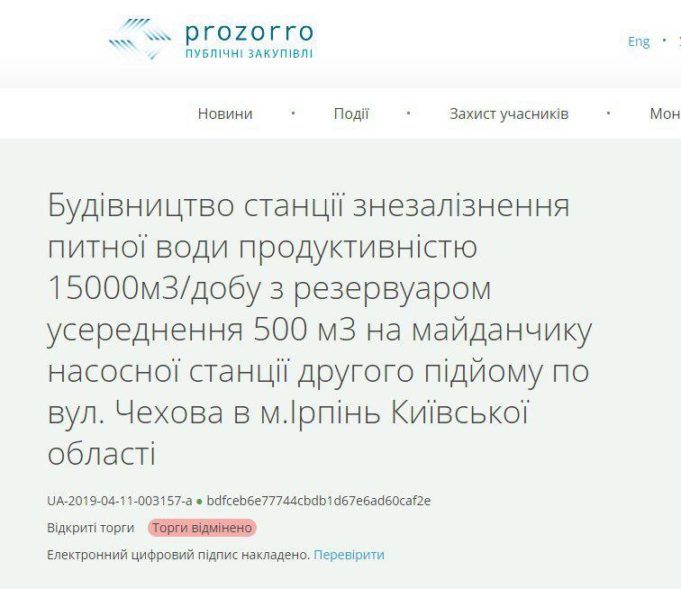 Тендер на "будівництво станції по знезалізненню води” в Ірпені наразі відмінено. Таке повідомлення нещодавно з'явилось на сайті на сайті публічних державних закупівель Прозорро. Офіційна підстава зазначена наступним чином: «у зв'язку з необхідністю допрацювати, відкоригувати і перевірити технічні та інші...